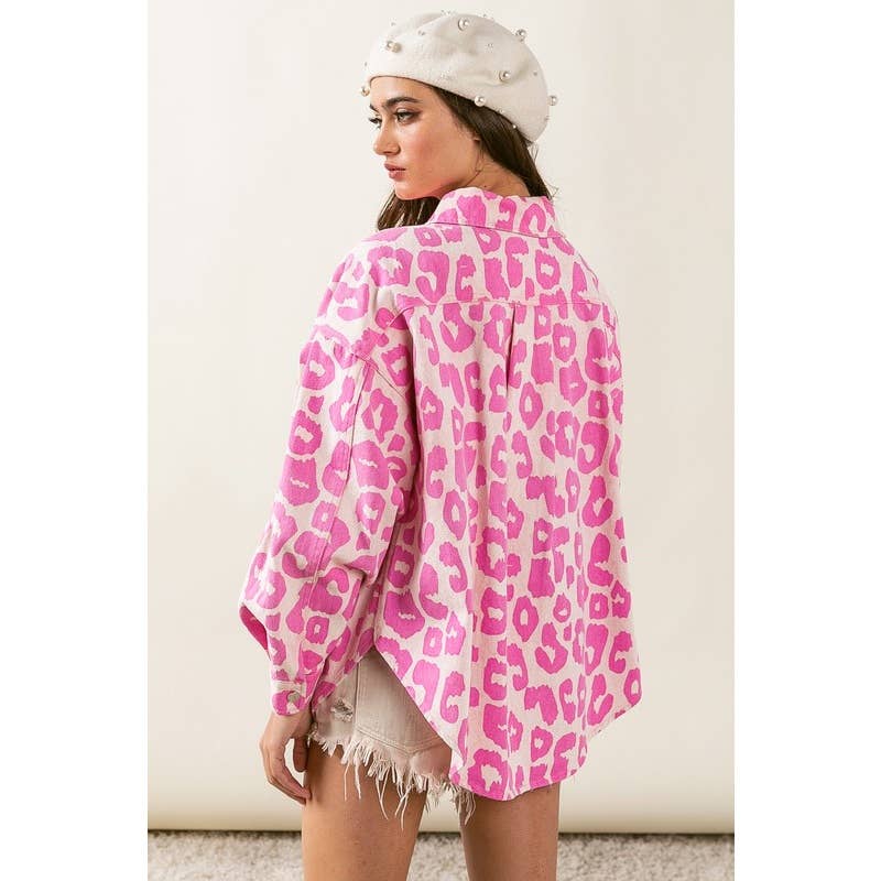 BiBi bold pink leopard print with a trendy washed finish 🧥 Oversized fit for comfy, laid-back vibes 👚 Shacket style - perfect blend of shirt and jacket 🔘 Button-down front for easy layering ✨ Stylish and cozy for everyday wear.Â